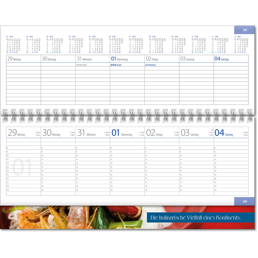 einsprachiges Kalendarium Angabe der Kalenderwochen 7 Spalten pro Woche und 12-Monatsübersicht Tages- und Zinszählung Stundeneinteilung, oberes Blatt Platz für Notizen, unteres Blatt 8–19 Uhr Jahres- und Monatsübersichten, Ferientermine D/A/CH |